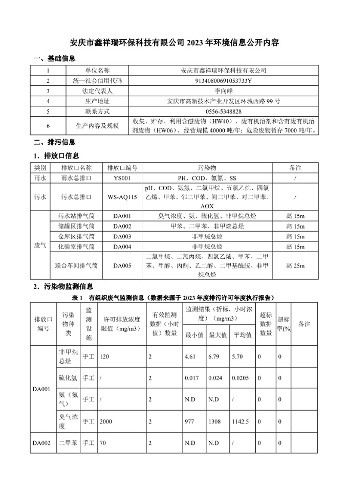 安慶市鑫祥瑞環(huán)保科技有限公司2023年環(huán)境信息公開(kāi)內(nèi)容